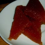 - When cool, turn out onto a large cutting board. Fill a large vase or cup with hot water and have a clean towel by your side. Cut parchment into squares approximately 2” x 6”. Cut quince paste into same size. Layer quince paste in between parchment paper and store in a Tupperware in the refrigerator.