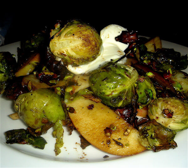 When the Brussels sprouts are finished cooking, remove from the oven, transfer to a bowl, and add the pistachios and apple slices. Pour the reduced balsamic mixture into the bowl and toss to coat evenly.