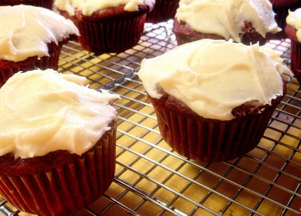 When a group of my New York friends came to visit last weekend and described these as “the best cupcakes ever,” I had to test a batch for myself. Indeed, the cake is moist and rich; the cocoa flavor, distinct; and the frosting, when soft and creamy, delicious. Impressive looking, festive, and easy to prepare, what’s not to love. Perfect for Valentine’s Day if you ask me.