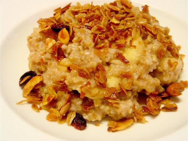While oatmeal cooks, finely dice the date and slice the banana. Place fruit in a bowl, top with the cooked oatmeal and stir to combine. The date and the banana should sweeten the oatmeal sufficiently, but add a touch of sugar, brown sugar or honey if necessary. Top with granola if desired.