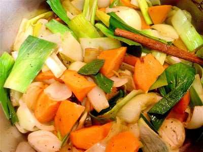 Meanwhile, cut the leek into big chunks and soak in a bowl of cold water, separating the layers to make sure each is well cleaned. Roughly chop the onion and the carrot into medium-large pieces. This should yield about 3 cups leeks, and 2 cups each of carrots and onions.