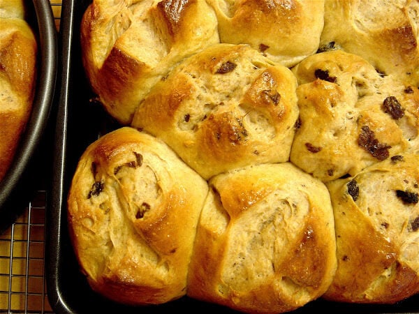 At this point, if you wish to add raisins, divide the dough into two equal portions. Flatten one of the portions and sprinkle _ cup raisins over it. Fold dough to enclose the raisins, then knead for 4 more minutes until raisins are evenly dispersed. (Note: If you wish to add raisins to all of the dough, add ½ cup raisins to whole ball — do not divide the dough — and knead for a total of 8 minutes.) Place dough in greased bowl, cover with plastic wrap and let rise for 1 hour or until almost doubled in bulk.