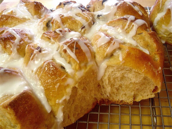 Preheat the oven to 350ºF. Remove pans from refrigerator and with a very sharp knife or razor blade, make a cross through each bun. Beat egg with the two teaspoons of milk, brush buns with the mixture, place in the oven and bake for 25-30 minutes. Meanwhile, whisk the confectioners’ sugar with milk to make the glaze.