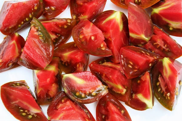 I never thought I would say that I have a favorite tomato, but as of this past Saturday I do. As I passed through Reading Terminal Market on my way to the Fair Food Farmstand, I stopped at the Livengood stand, struck by the array of tomatoes on their table. I asked one of the men to suggest a tomato for a simple salad and he handed me a Black Prince. I purchased a dozen, made my way to the Farmstand for grass-fed ground beef, then headed home.