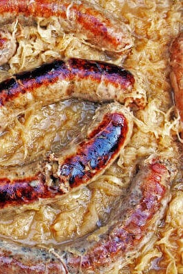 Heat the oil in a 12-inch skillet over medium-high heat. Brown the sausage on all sides, then transfer to a plate. Add the onion and juniper berries and sauté until the onions are tender, about five to seven minutes, seasoning with salt and pepper to taste. Add the stock, sauerkraut and apples, and stir to combine, scraping any browned bits from the bottom of the pan. Nestle the sausage back into the sauerkraut mixture, bring to a simmer, cover and cook over low heat until the sausages are cooked through and some of the liquid has evaporated, about 25 to 30 minutes.