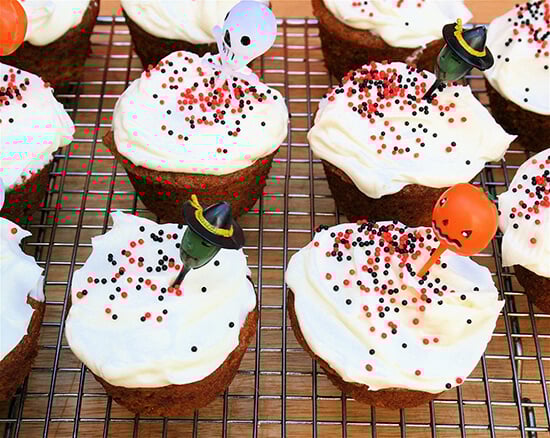 Preheat the oven to 350ºF. Whisk together the flour and baking powder. In a separate bowl, whisk the remaining ingredients. Combine the wet and dry ingredients and mix only until just combined. Place paper liners in muffin pan or coat with cooking spray. Fill each cup only three-quarters full. Bake 20 to 25 minutes or until an inserted knife comes out clean. Let cool completely before frosting.