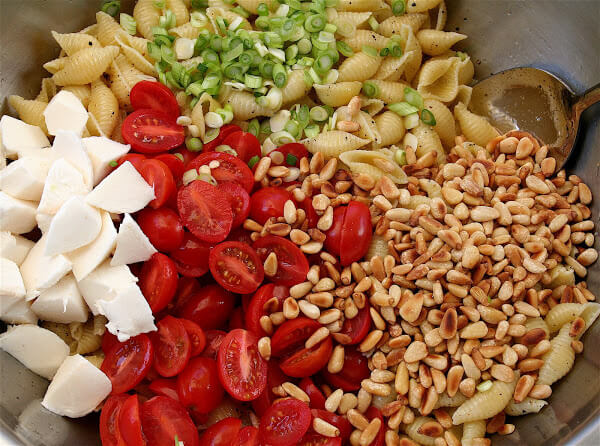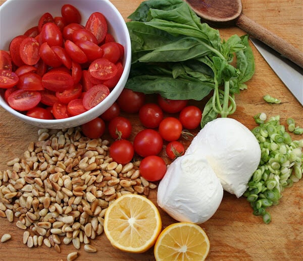 - Cut grape tomatoes in half lengthwise. Remove ends from scallions and discard. Chop thinly, using mostly the white and pale green parts (some of the dark green is ok, too). Chop the roasted red peppers into small strips. Cut the mozzarella into cubes about the same size as the cherry tomatoes (or if you are using the ciliegine, use them whole or slice in half). Set aside.
