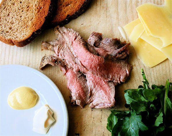 And, for a change, Ben had some more desirable leftovers to bring to work this week. Piled in between two slices of whole wheat bread, slathered with mustard and mayo, and topped with arugula and cheddar cheese, flank steak makes a great sandwich — a vast improvement over the mixture of chard and brown rice Ben often zaps in the microwave for lunch.
