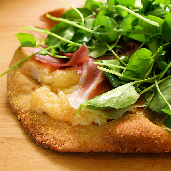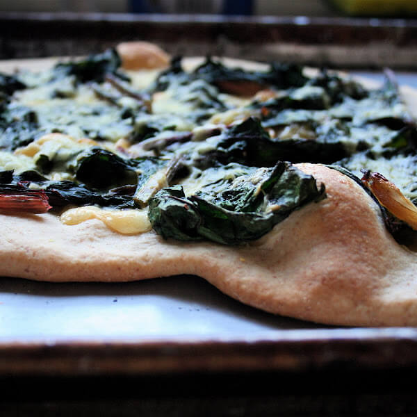 Same dough as pictured above, but topped with sautéed Swiss chard, Parmigiano Reggiano and smoked Gouda:
