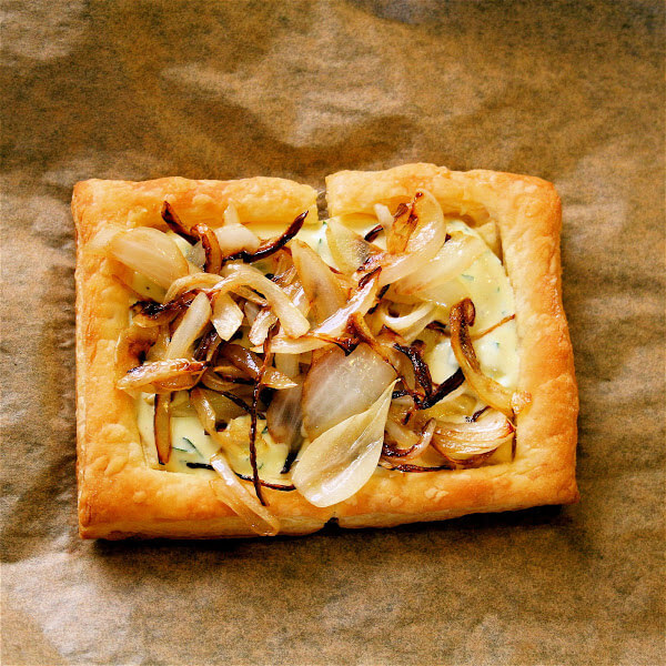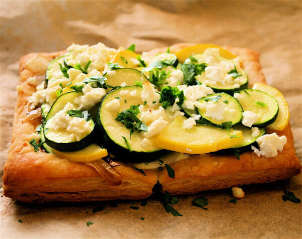 - In a small bowl, whisk together the ricotta, egg and parsley. Season with salt and pepper to taste and spread onto puff pastry. Top with the onions. Arrange squash pieces in overlapping rows until tart is filled. Bake for 15 minutes. Remove from oven, brush with butter and return to the oven for five minutes longer. Remove pan from oven, sprinkle with feta, and let cool for 10 minutes before serving.