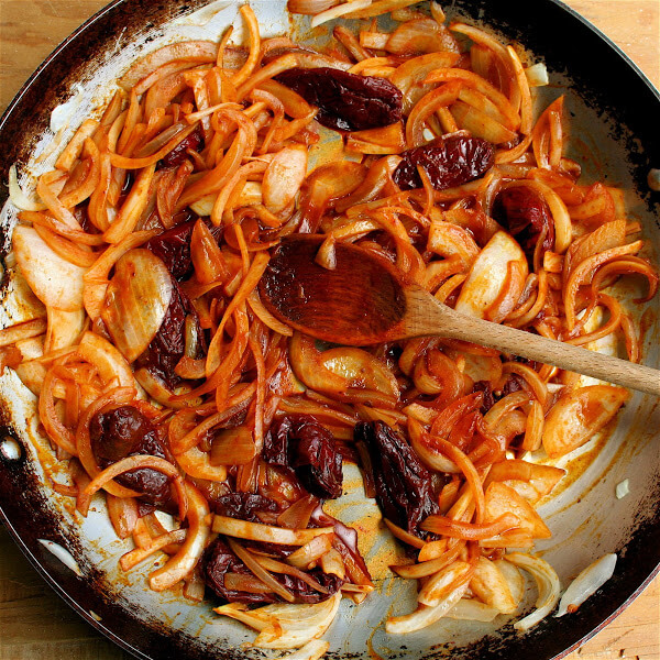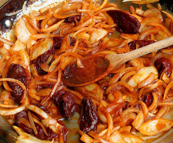 Onions and chipotles cooking before the chicken, stock and tomatoes are added.
