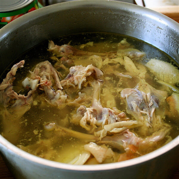 Making stock is as simple as throwing chickens in a pot, covering them with water, and letting them simmer for a few hours. Additions such as onions, carrots, celery, bay leaves, peppercorns, etc., of course, enhance the flavor of the stock, but if you don’t have them or don’t feel like adding them, it doesn’t matter.