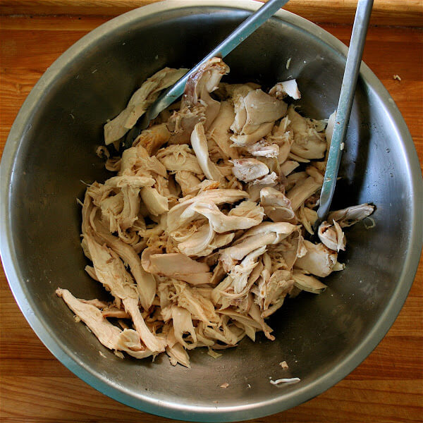 Chicken, pulled from its bones after simmering in water for about an hour.