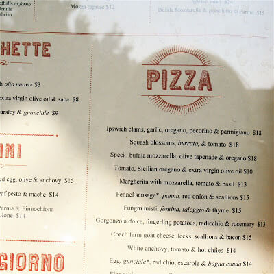 To start, we shared one order of fried squash blossoms — one order of delicately battered, ricotta-filled, piping-hot blossoms. Unbelievably tasty. For pizzas, we ordered the Ipswich clam (clams, oregano, pecorino and Parmigiano) and the Margherita (tomato, mozzarella and basil.) These wood-fired pizzas, I hate to admit, rival Bar’s, my absolute favorite spot on earth to eat pizza. (I’ve never been to Italy.) Two Amy’s in northwest Washington D.C. is a close second. Pizzeria Mozza, if I lived closer and if I didn’t need to make a reservation a month in advance, would surely be third. I loved everything about this place.