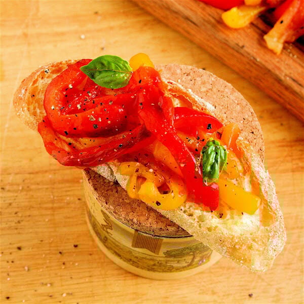 For a simple appetizer: Bring the roasted red peppers to room temperature — the cold masks their flavor. Slice the peppers into slivers. place on a platter. Taste. Sometimes the peppers are so sweet that they don’t need anything. If they need a little seasoning, however, drizzle lightly with olive oil, sprinkle lightly with salt and pepper, and top with fresh herbs, such as thinly sliced basil or parsley. Serve with warm bread.