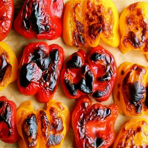 - Meanwhile, cut peppers in half lengthwise. Remove seeds and white veins. Place peppers cut-side down on parchment paper. (Alternatively, rub a small amount of olive oil on the sheet tray.) Place pan in the oven for about 30 to 40 minutes, until the skin is blistery and charred. Don’t be impatient here: If the skin isn’t blistery enough, the peppers will be difficult to peel.