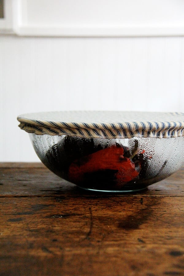 - Place the peppers in a large bowl and cover with plastic wrap or a cloth bowl cover or tea towel. Let sit for at least 20 minutes and up to 4 or 5 hours (or longer.) When cool enough to handle, remove the skin and discard.