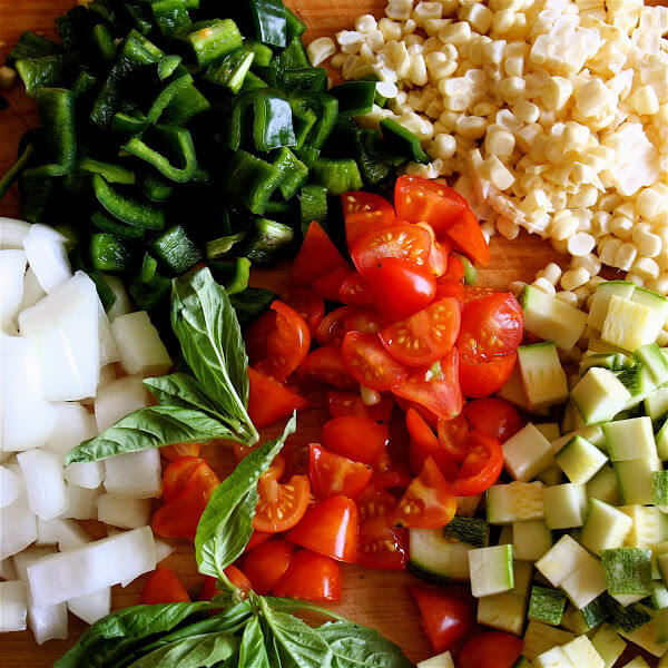 Once the vegetables are all chopped, this sauté takes five minutes to complete. Use high heat and cook the peppers and onions first. Add the corn with the zucchini once the onion bits look a little brown. Cook for another minute or so, and add the chopped cherry tomatoes and basil at the end with the pan off the heat.