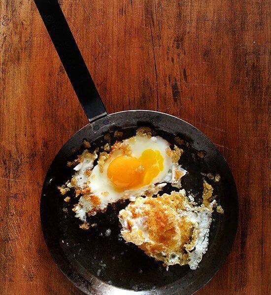- The moment you see the crumbs begin to color, quickly add the remaining oil (or a dab of butter) and the herbs if using, then crack the eggs directly onto the crumbs. Cook the eggs as you like. (So far, I’ve made them two ways: without flipping them, but by finishing them in a heated oven so the tops cooked through a tiny bit; and flipping them, but cooking the eggs only briefly on the second side — the yolks were still runny.)