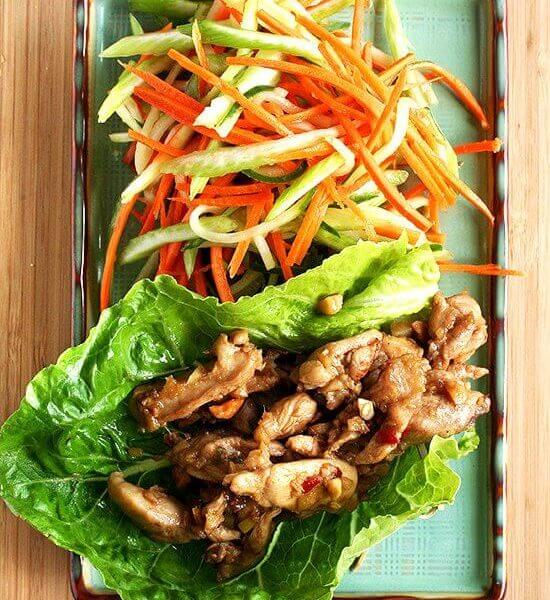 - To assemble and serve, set out the slaw and chicken in bowls along with a platter of the lettuce. Wrap a scoop of slaw and chicken in each lettuce leaf. Have a napkin handy!