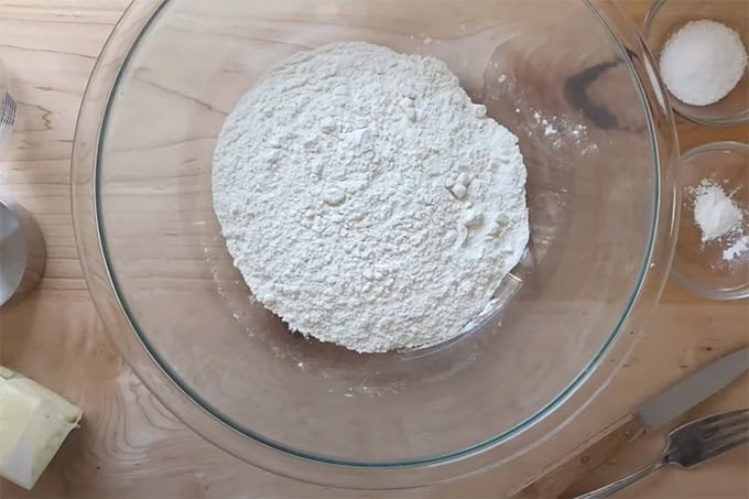 - Whisk flour, baking powder, and salt together in a medium bowl. Add the softened butter and use the back of a fork to blend it into the flour mixture.