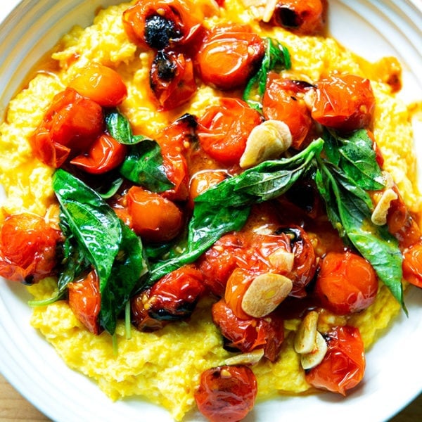 - Spoon the polenta into a serving bowl. Top with the jammy, blistered tomatoes. Top with some grated Parmigiano Reggiano and pepper to taste if you wish.