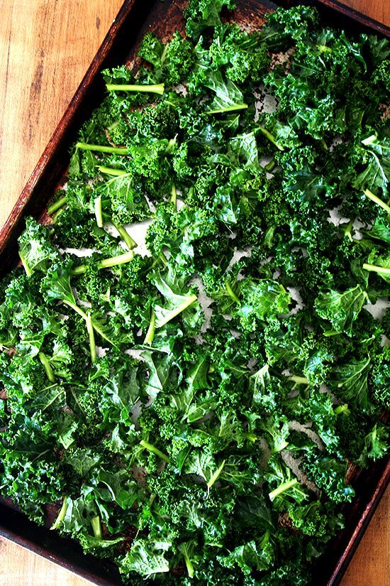 - Preheat the oven to 350ºF. Tear kale into smallish-sized pieces as pictured above. Toss lightly with olive oil and kosher salt. Spread evenly on a sheet tray. Don’t be afraid to fill it up — it shrinks way down while it bakes (see picture below.)