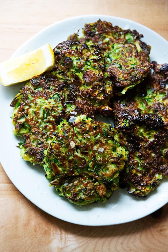 This is an old recipe that I recently updated and simplified, by removing the herbs and onions and replacing them with sliced scallions, which I always have a ton of on hand in the summer thanks to my farm share. I also omitted the lemon zest, opting instead to finish the fritters with a squeeze of fresh lemon juice. Finally, the original recipe called for some grated potato as well, which is a nice addition if you have it, but not missed if you don’t.