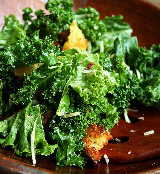 Note: The measurements below are those that are given in the book. Obviously, adjust quantities as needed. I tossed enough kale for two people with dressing to taste. I also added the croutons and Parmigiano Reggiano to taste.