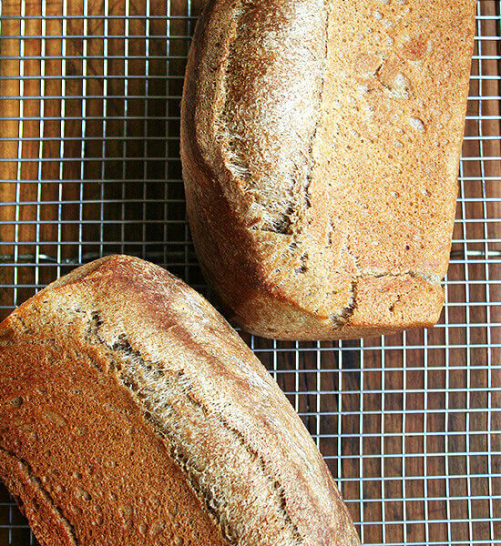 Bake loaves for 45 minutes. Turn loaves out onto cooling rack. If you can refrain, let cool for at least 20 minutes before cutting.