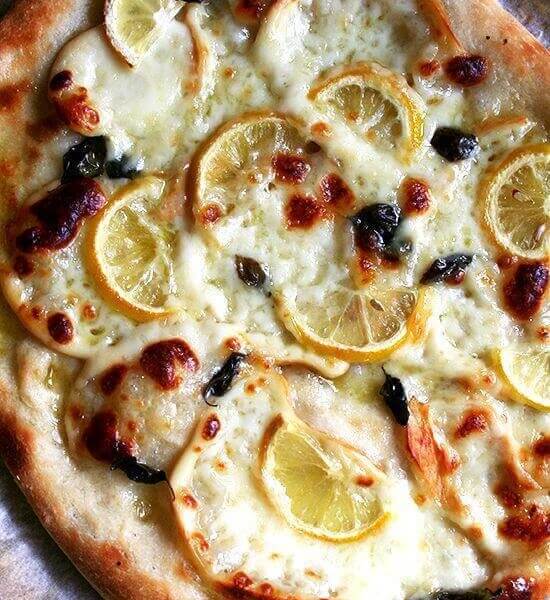 - Place dough on a rimmed baking sheet and stretch, using your fingers, until it is approximately 8 to 10 inches in diameter. Distribute 3 ounces cheese over the surface, leaving a 1-inch rim. Arrange 6 lemon slices over cheese and tuck in 5 basil leaves, then drizzle everything lightly with oil, including the rim. Place on highest rack in the oven and bake until puffy, about 6 minutes; then turn on the broiler and broil until the crust takes on some color, 30-60 seconds. (Note: I skipped the broiling step.) Remove pizza from oven and serve. Repeat with remaining dough.