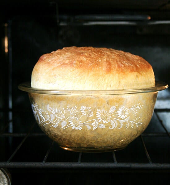 Because this is a very wet dough, it must be baked in an oven-proof bowl. I am partial to the Pyrex 1L 322 size, but any similarly sized oven-proof bowl will work.