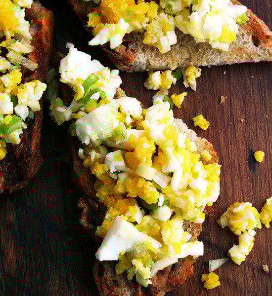 - Arrange the arugula over each piece of bread. Cut the top 1/2 inch off the eggs and, using a spoon, scoop them out of their shells in large spoonfuls onto the bread. Note: I tried this, but failed. I just had an easier time peeling the eggs, gently mashing them with a fork, seasoning them with a pinch of salt and pepper and a few chopped scallions (just because I had them), and then spooning this mixture over the grilled bread. Drizzle each piece with a few spoonfuls of the warm bagna cauda. Serve more bagna cauda on the side just in case.
