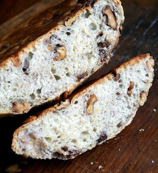- When the dough has doubled, punch it down using your hands or two forks or however you like to do this. Sprinkle the walnuts over top and gently knead them into the dough so that they are evenly dispersed. If your hand gets too sticky (which they likely will), dip them in water to make the kneading process a little easier. Once the walnuts have been added, drizzle the dough with the additional tablespoon of walnut oil and turn the dough to coat, adding a drizzling more of the walnut oil if necessary. (Notes: Adding flour at this point versus water to help with the sticking issue might be an instinct for many of you, but I shied away from adding flour after reading some of the notes in Tartine Bread. I think adding too much flour can affect the final flavor and texture of the bread, so I prefer to use water. This step is a little annoying, but just get through it quickly without worrying too much that the walnuts are completely evenly dispersed — they will be.)