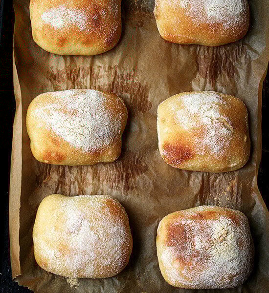 And when the dough, instead of being shaped into two loaves, is portioned into roll-sized pieces and sprinkled, just like those ever-so-promising gnudi, heavily with semolina flour, and gently stretched into squares or elongated “slippers,” it bakes off into light sandwich rolls, crispy on the exterior and soft on the interior.