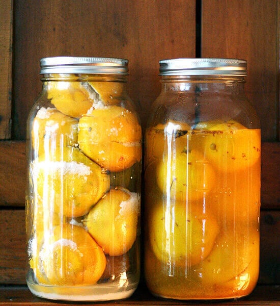 - After the initial period, remove the lid and press the lemons as hard as you can to squeeze out as much of the juice as possible. Add the rosemary and chile, if using, and the lemon juice, and cover with a thin layer of olive oil—I don’d do this olive oil step. Seal the jar, transfer to the fridge, and leave for at least 4 weeks. The longer you leave them, the better the flavor.
