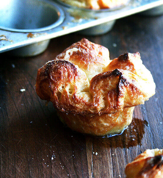 - Butter a 12-cup muffin tin. Lift corners of each square and press into the center. Fit each pinched parcel into each muffin cup. Cover with plastic wrap and place in the fridge.