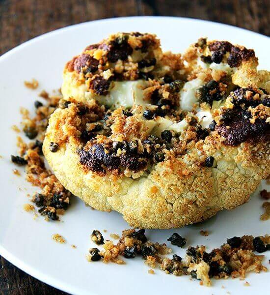 - Place cauliflower on serving platter. Spoon buttered caper breadcrumbs all over. Serve with lemon wedges if desired. Pass sea salt if necessary.