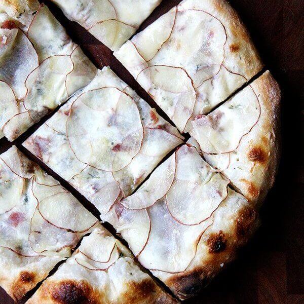 Here I’ve cooked the bacon and omitted the onion. It is simple and delicious and reminds me of my favorite mashed potato and bacon pizza at Bar. Here’s the Food and Wine recipe for reference.