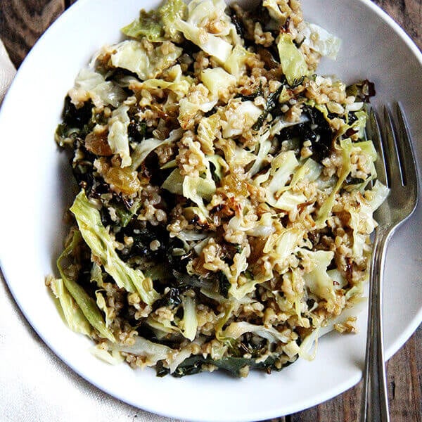So many vegetables could work here: cabbage, kale, cauliflower, broccoli, parsnips, carrots, squash, etc. If you are using kale and cabbage, slice the leaves relatively finely or at least try to make the vegetables you are roasting together be uniform in size so that they cook evenly. Freekeh is not something I’ve cooked with many times, but I happened to have a bag of it on hand, and I think I’ll be buying it more often. It cooks quickly and has a nice, chewy texture — it reminds me of bulgur. Freekeh is harvested when it’s young or “green” then roasted, which gives it a slightly smoky, nutty flavor. Use any grain in place of the freekeh: farro, wheat berry, quinoa, bulgur, etc. I’ve used both currants and golden raisins, but chopped dates would be nice, too — anything to add a touch of sweetness. Nuts would be a nice addition here.