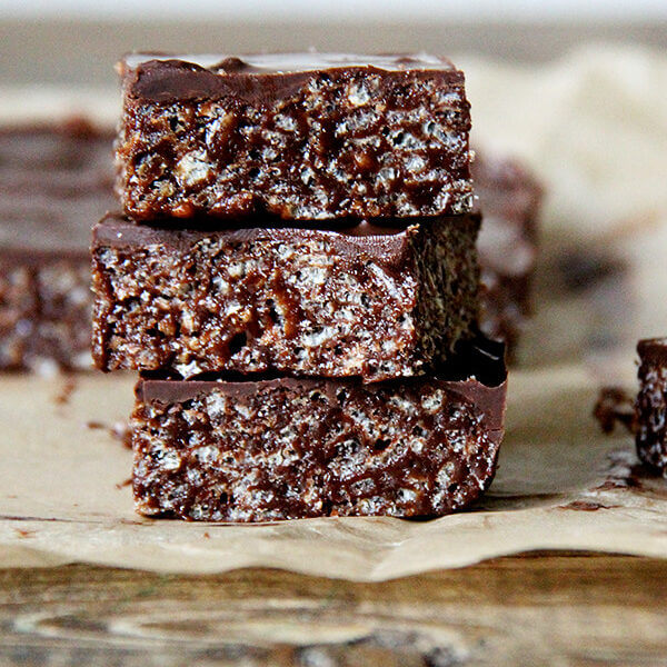 - In a small saucepan, bring the maple and rice syrups to a rolling boil for 1 minute, stirring frequently with a heatproof spatula or wooden spoon (be careful not to let it boil over). Remove from the heat and stir in the nut butter, ½ cup chocolate, 2 tablespoons coconut oil, and ¼ teaspoon fine salt until everything is smooth and the chocolate is melted. Place the rice cereal in a large bowl and pour the syrup mixture over top. Stir to combine, then pack the mixture firmly and evenly into the lined pan (you may want to dampen your fingers to prevent sticking).