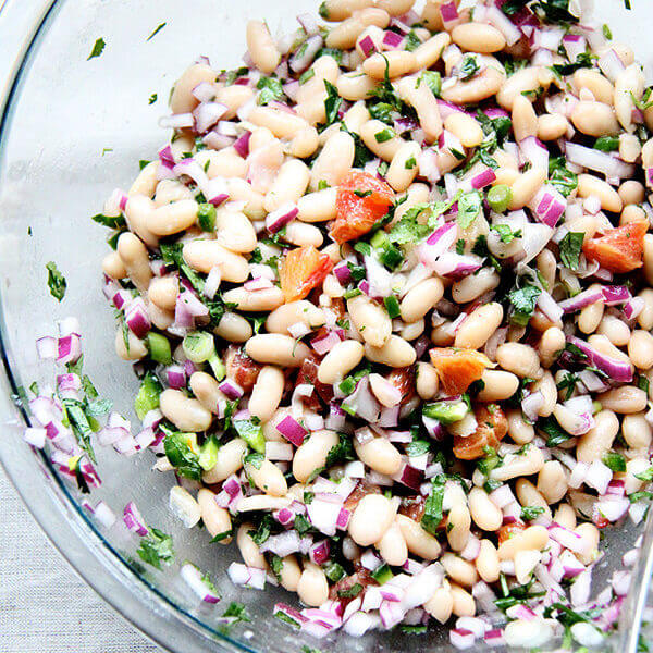 I’ve made this with Goya cannellini beans and fancy Marcella beans — any white bean will work. This salsa can made more into a salad by upping the olive oil and cutting back on the vinegar and lime to taste. It could also be bulked up with farro or some other grain. Here is an ancient video that may offer some guidance on peeling and cutting the orange.