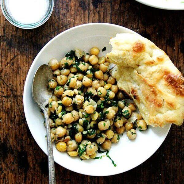 Normally I can’t squeeze enough lemon or sprinkle enough vinegar over these sorts of salads, but I really like these chickpeas without any acid. If you have leftover cooked chickpeas, store them in the fridge in their cooking liquid. This sauté is great day-old, too, though the color of the herbs dulls after a night in the fridge.