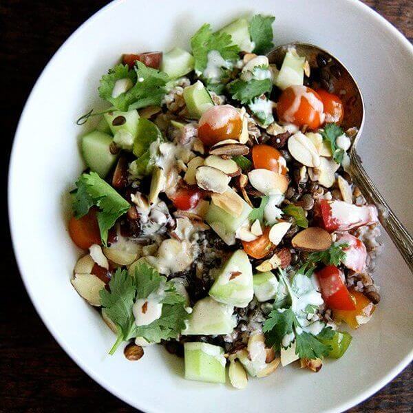 - To assemble bowls, scoop some bulgur into each bowl, spoon some lentils over top. Scatter over a handful of diced cucumbers, tomatoes, herbs, and almonds. Drizzle with the lemon-tahini dressing. Season with sea salt and pepper to taste. Serve with lemon wedges and more dressing on the side.