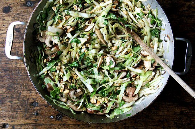 With peppers now out of season, I’ve been using shiitake mushrooms, whose meaty texture and woodsy flavor nicely complement the cabbage, and I imagine a number of other vegetables—julienned carrots, shredded Brussels sprouts or broccoli, for example—could also be used. In place of the traditional scrambled egg, the texture of which I never seem to get right, I’ve been baking cubes of tofu, dressed simply with soy sauce and oil, and folding those in at the end.