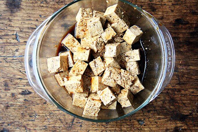 - Preheat the oven to 400ºF. Whisk together 2 tablespoons soy sauce and 1 tablespoon oil in a medium bowl. Add tofu cubes and gently toss to coat. Let cubes marinate while oven preheats—at least 5 minutes. Lightly rub a rimmed sheetpan with neutral oil. Place tofu cubes on pan, discarding the remaining marinade. Bake for 30 minutes. Remove pan from oven and set aside.