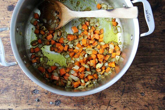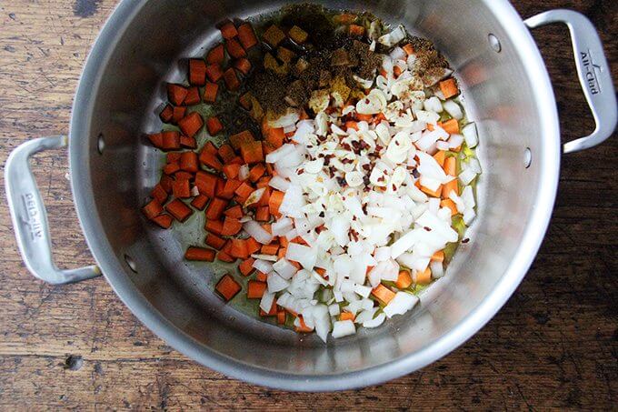 - In a large pot, place the oil, onions, carrots, garlic, cumin, curry, red pepper flakes, fresh pepper, and 1 teaspoon of salt. Bring to a sizzle over high heat, then reduce the heat to medium and cook, stirring occasionally to coat the vegetables in the spices, about 10 minutes.