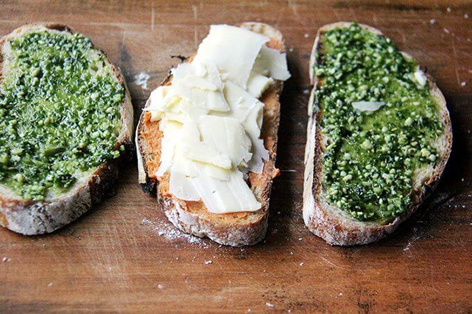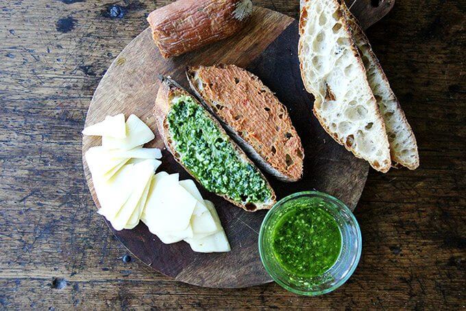 Be sure to use a sturdy bread that will stay intact when smeared with both pesto and ‘nduja. I love French peasant-style bread, but in keeping with the Italian theme here, ciabatta is a good choice. Be sure to slice it thickly to ensure the pesto, ‘nduja, and cheese don’t escape through the bread’s airy crumb.