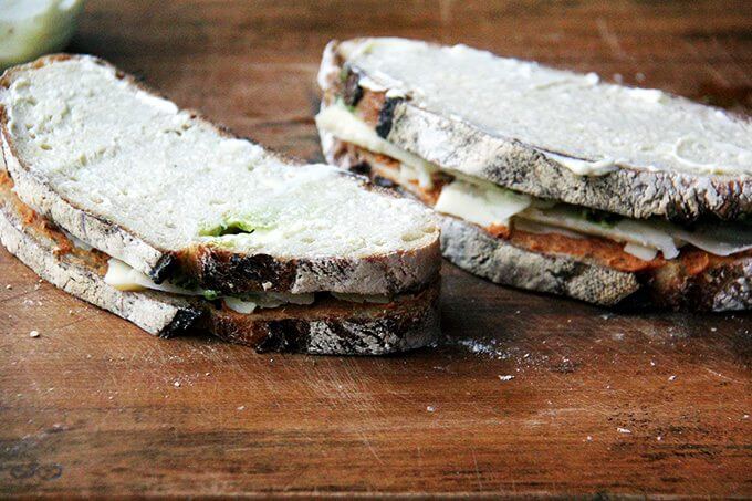 - Heat a cast iron skillet or large sauté pan over medium heat. Stir together the butter and mayonnaise in a small bowl. Spread one side of each piece of bread with this mixture. Place the butter-mayo slicked side of the bread down on a work surface. Working with one pair of slices at a time, spread 1 tablespoon of the pesto on one slice, and spread half of the ‘nduja on the other. Repeat with the other two slices of bread. Top one slice of each pair of bread with 1 to 2 ounces of Wisconsin fontina, depending on how cheesy you want it. Top with the second buttered slice.