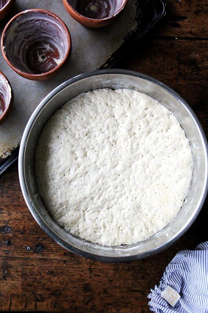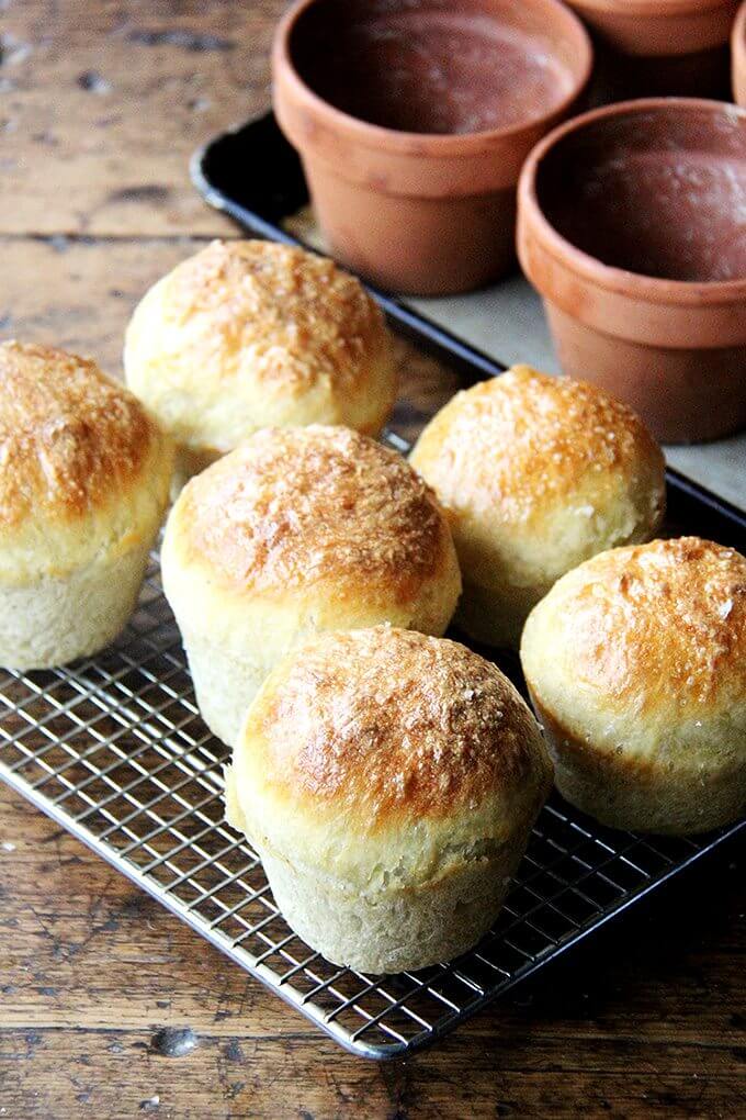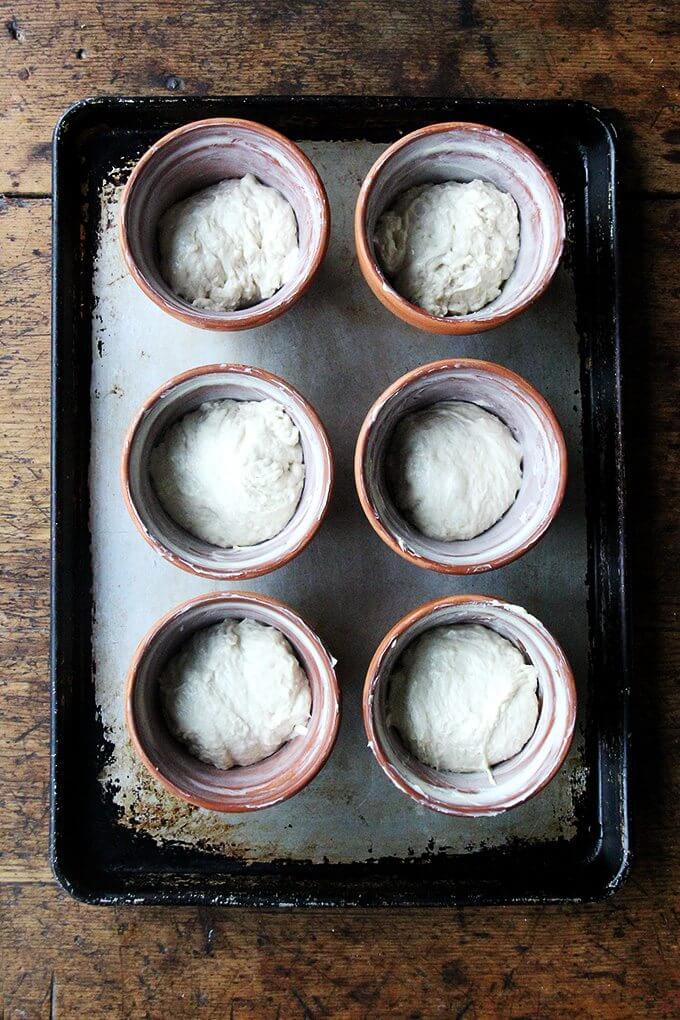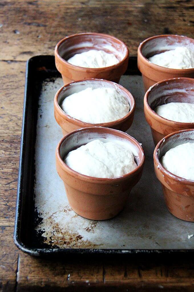 - Position an oven rack in the lower third of your oven. Preheat the oven to 425ºF. Grease 6 flowerpots (see notes above) with about a tablespoon of butter each—it is imperative to be generous here. Using two forks, punch down your dough, releasing it from the sides of the bowl, which it will be clinging to. As you release the dough from the sides, pull it towards the center. Then, take your two forks and divide the dough into two equal portions. Use your two forks to break off a third of one of these portions (1/6 of the total amount), and plop it in one of the buttered flowerpots. Repeat until all of the dough has been portioned into the pots—it’s OK if they aren’t evenly portioned out. Place the pots on a rimmed baking sheet.